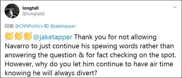 “塔普爾,感謝你不讓納瓦羅繼續瞎説下去,而不是讓他回答問題,並當場進行事實核查。但是,為什麼你明知道他總會轉移注意力,還讓他上電視呢?”