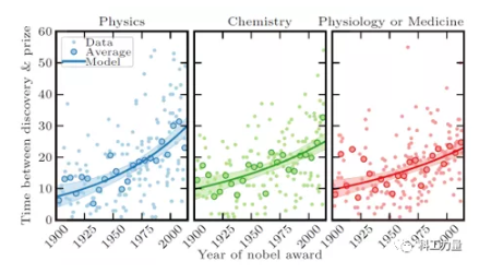從數據上,我們也能明顯地看到這一點。通過對諾貝爾獎得主做出突破性成果到獲獎的時間進行迴歸分析,這一時間逐漸越來越長,但是增長速度低於諾獎得主年齡的增長。