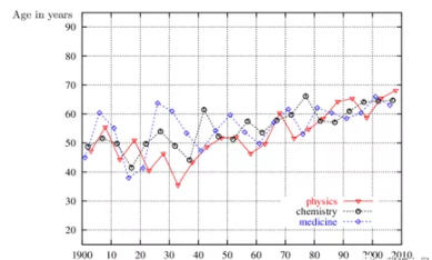 1901-2010年諾貝爾科學獎(醫學/物理/化學)得主的當年平均年齡