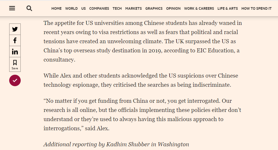 本月8日,《金融時報》報道稱,由於簽證限制,以及擔心政治與種族關係緊張所造成的不友善氣氛,美國對中國留學生的吸引力近年來已經下降了。現在英國成了中國留學生的首選(報道截圖)