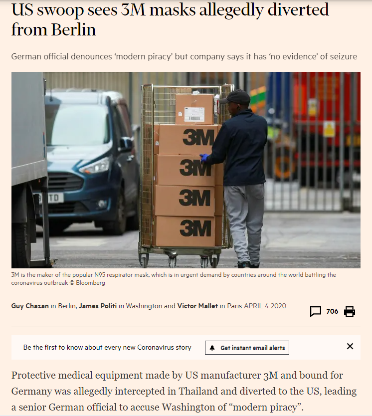 據《金融時報》報道,今年四月時一批原定於送往德國的美國3M公司的N95口罩在曼谷被美方攔截並運往美國。一名德國高級官員譴責美國的做法宛如“現代海盜”。(報道截圖)