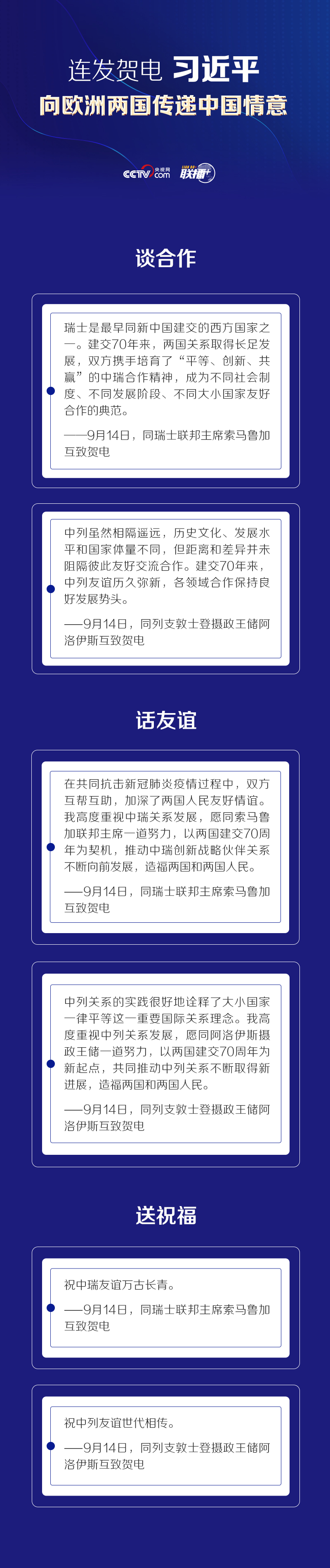 9月14日,習近平主席就中瑞、中列建交70週年,分別同瑞士聯邦主席索馬魯加、列支敦士登攝政王儲阿洛伊斯互致賀電。
