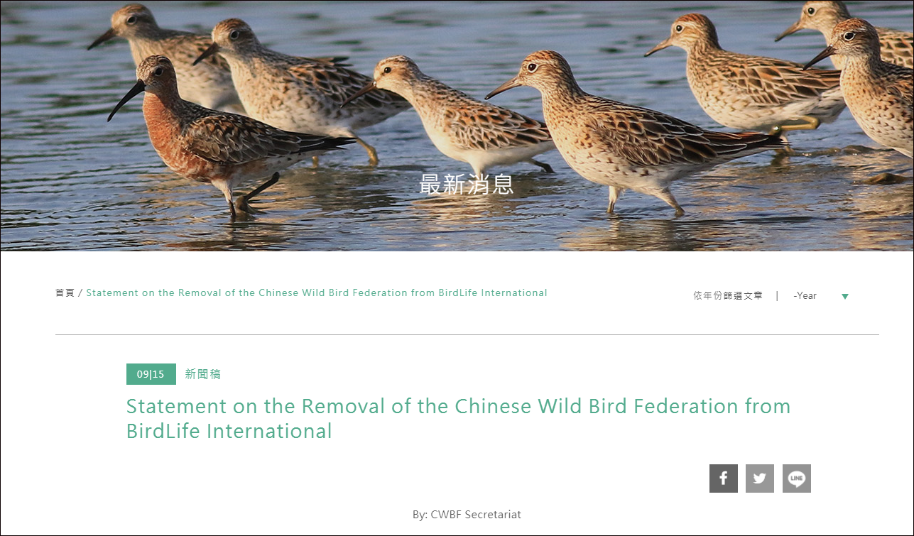 9月15日,台灣鳥會(全稱“中華野鳥學會”)在官網發佈中英文聲明稱,該組織被國際鳥盟(BirdLife International)除名,原因在於“因中文名稱對國際鳥盟的夥伴關係造成經營風險”。
