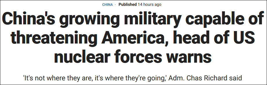 據福克斯新聞網14日報道,作為美軍核力量的負責人,理查德在當天一場新聞發佈會上再度拋出“中國威脅論”,警告中國軍力的大幅增長已表明,這個亞洲國家正在以多麼快的速度建立自己的核武庫,從而達到“直接威脅美國的能力”。