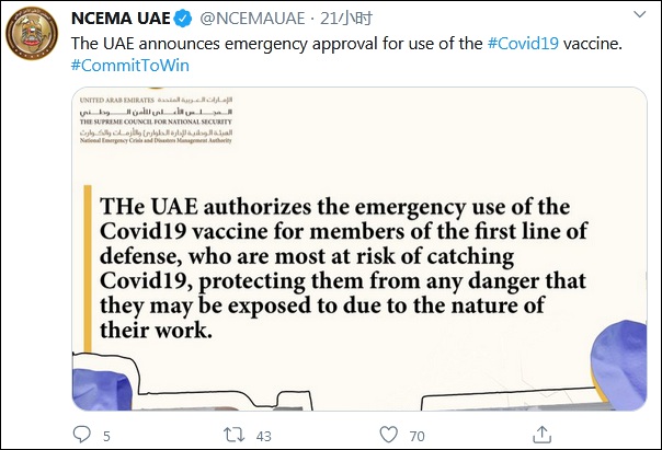 阿聯酋緊急批准使用中國新冠疫苗,接種對象為一線醫務人員
