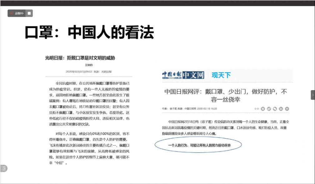 我這地方摘了兩篇文章,一篇是2月7日《光明日報》的,一篇是2月18日《中國日報》的。這兩篇都講了戴口罩是一件很重要的事情,是涉及到文明的問題,一個人的行為,可能影響所有人的努力。這是一個牽扯到公眾的事情,不是一個個人選擇的問題。