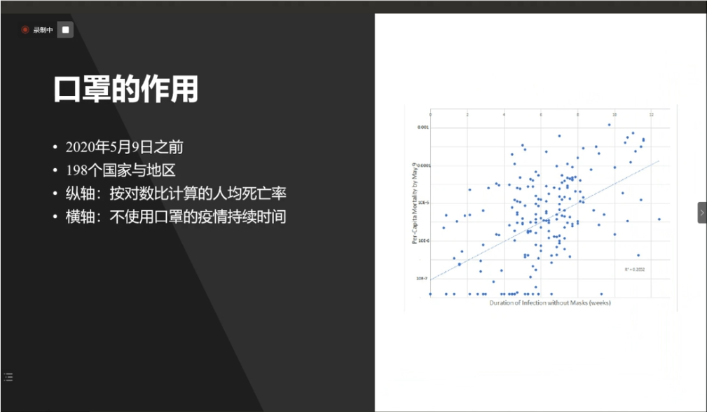 口罩有沒有用呢?其實早就有人開始做了研究,而且也得出了結論。有一項研究是在5月9日以前做出的,一共分析了198個國家和地區的數據。這張圖的橫軸顯示的是疫情期間不戴口罩的持續時間,縱軸是得了新冠肺炎以後的人均死亡率。可以看得很清楚,就是疫情之間不要求戴口罩的時間越長,死亡率越高。所以戴口罩的作用其實是非常明顯的。