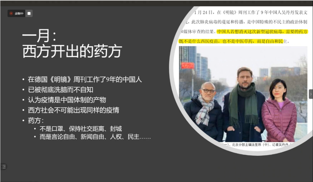 這張圖可能很多人也看過。1月24日武漢封城第二天,德國的《明鏡》週刊出了一個專刊,專門講武漢的疫情。這是很惡毒的一個專刊。裏面有一篇文章的作者是一個在《明鏡》工作了9年的中國人,她被西方的東西洗腦洗得已經不自知了。她認為這個疫情是中國體制的產物,這種疫情只可能在中國這種體制下產生,西方社會不可能出現這樣的疫情。中國要想克服這個疫情,不是要靠口罩,不是要靠什麼封城,而是靠言論自由、新聞自由、人權、民主等等。這是1月份西方開出的藥方。