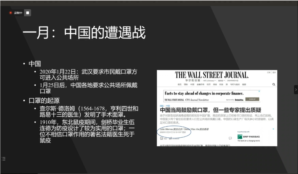 但是,當中國人開始戴口罩的時候,國外是普遍懷疑的。我在這裏貼了一個《華爾街日報》1月31日發自北京的一條消息,説“中國當局鼓勵戴口罩,但是一些專家提出質疑”。那麼國外的人覺得靠譜的是什麼呢?
