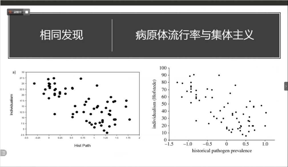 兩張圖中的橫軸都是歷史上這些地區流行病發生的頻率,縱軸都是個人主義水平。我們能看到一個明顯的相關關係,就是歷史上流行病發病比較多的地區很可能促使這些地方的人多一些集體主義,少一點個人主義。而那些以前發病比較少的地方,可能個人主義的成分就比較多一些。