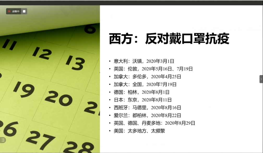 西方反對戴口罩的抗議是非常多的。我們可以看這張圖。美國我沒有列舉,因為美國這種活動太多、太頻繁,舉不勝舉。