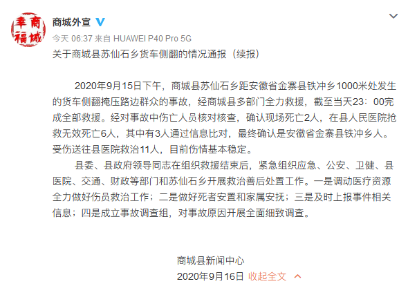 河南省信陽市商城縣融媒體中心官方微博“商城外宣”9月16日消息,2020年9月15日下午,商城縣蘇仙石鄉距安徽省金寨縣鐵衝鄉1000米處發生的貨車側翻掩壓路邊羣眾的事故,經商城縣多部門全力救援,截至當天23:00完成全部救援。經對事故中傷亡人員核對核查,確認現場死亡2人,在縣人民醫院搶救無效死亡6人,其中有3人通過信息比對,最終確認是安徽省金寨縣鐵衝鄉人。受傷送往縣醫院救治11人,目前傷情基本穩定。