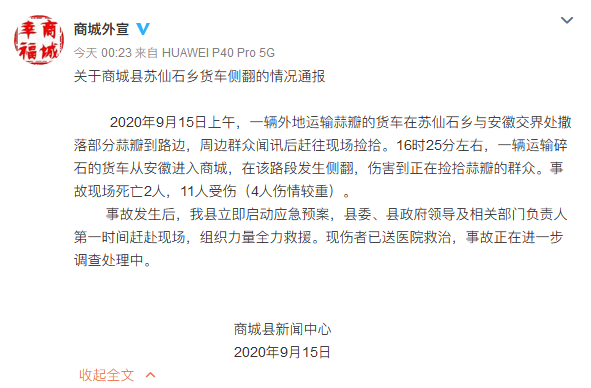 此前,9月16日凌晨,商城縣通報稱,2020年9月15日上午,一輛外地運輸蒜瓣的貨車在蘇仙石鄉與安徽交界處撒落部分蒜瓣到路邊,周邊羣眾聞訊後趕往現場撿拾。16時25分左右,一輛運輸碎石的貨車從安徽進入商城,在該路段發生側翻,傷害到正在撿拾蒜瓣的羣眾。事故現場死亡2人,11人受傷(4人傷情較重)。