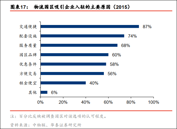 根據中物聯2015年的調研,除了交通便捷之外,配套設施、服務質量、方便交易等因素也都是吸引企業入駐物流園區的主要原因,得到50%以上的認可度。另外,傳化智聯還在2017年時獲得央行第三方支付牌照,利用公路港的天然優勢,開拓金融支付業務。