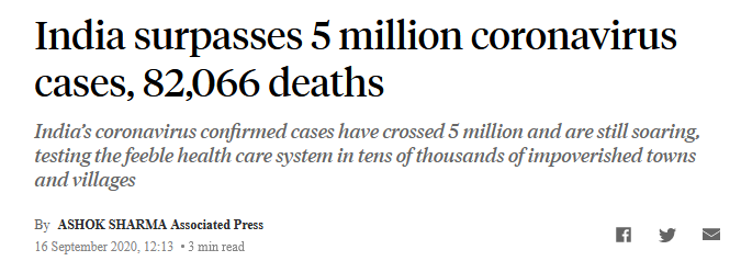 (觀察者網訊)當地時間9月16日,美國廣播公司(ABC News)報道稱,印度聯邦衞生部數據顯示,該國境內新冠肺炎確診數在週三激增至500萬人以上,達到5020359例,累計死亡病例82066例。過去24小時,印度新增90123例確診病例,新增1290例死亡病例。