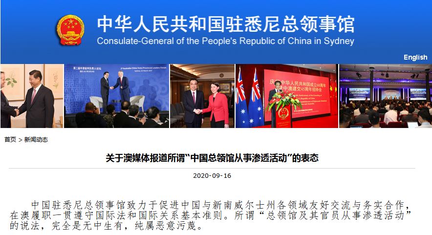 針對澳媒的相關報道,中國駐悉尼總領事館16日嚴正指出:所謂“總領館及其官員從事滲透活動”的説法,完全是無中生有,純屬惡意污衊。