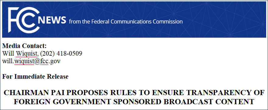 FCC在當天的一份聲明中稱,阿吉爾·帕伊提出的這項“規則制定建議通知”(NPRM)尋求修改目前FCC關於節目贊助的條款。根據帕伊的提出的建議,無論外國政府實體是免費還是用直接或間接付費的方式,向美國廣播台和電視台提供節目內容,廣播台和電視台都必須在播放節目的時候做出具體信息披露,明確指出節目背後所涉及的外國政府。