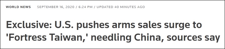 9月16日,路透社援引四名知情人士的消息稱,美國政府計劃向民進黨當局出售包括水雷、岸艦導彈和無人機在內的七種武器系統。