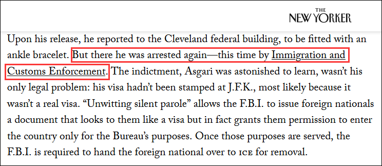 原來,2017年6月底,當阿斯加里抵達肯尼迪國際機場後被FBI逮捕時,他的簽證並沒有在機場被蓋章。《紐約客》稱,可能阿斯加里一開始拿到的就不是真正的簽證。報道稱,他拿到的簽證可能是FBI向外國公民臨時簽發的一種類似簽證的文件,這隻允許他們入境,一旦“某些條件”滿足,FBI就會把人移交給ICE處理。