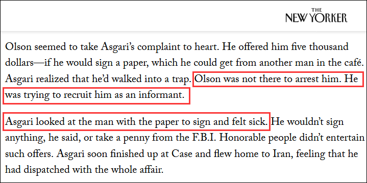 此後,阿斯加里和奧爾森聯繫上了,起初他們只是在咖啡館隨意地聊聊家常,後來又聊到了阿斯加里假期前來美國、在實驗室工作以及工作簽證無法獲批等事情。此時,這名FBI特工突然稱可以給阿斯加里提供5000美元的報酬,只要他願意去伊朗為FBI做“線人”。與此同時,咖啡館角落裏躲着的另一個人遞上了一份合同,希望阿斯加里能夠簽字。