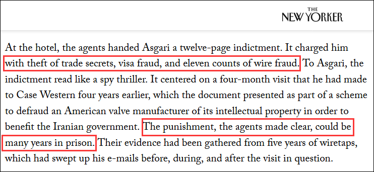 此外,從《紐約客》的報道來看,像是阿斯加里被控的“竊取商業機密”,FBI也找不到什麼證據。博格斯曾找到凱斯西儲大學的科學家亞瑟·豪爾(Arthur Heuer)詢問,得到的答案是,阿斯加里在實驗室的工作內容既不是機密,也不是專利,所謂“竊取商業機密”根本站不住腳。