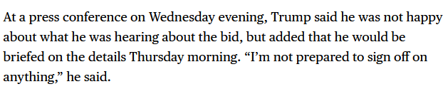 而據CNBC消息,特朗普還稱自己被告知,美國財政部將無法從這次交易中拿到補償。