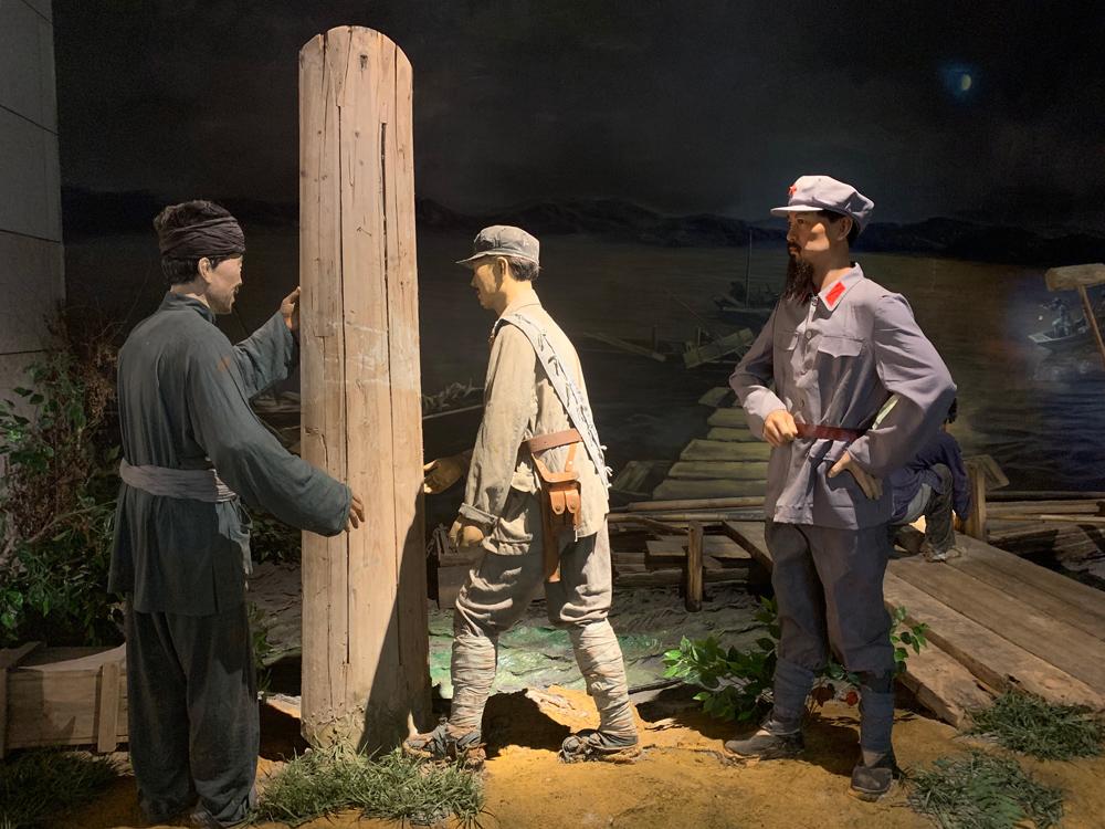 △中央紅軍出發紀念館再現於都老人將自己的棺木捐給紅軍搭浮橋的場景。(總枱央視記者郭晗光拍攝)