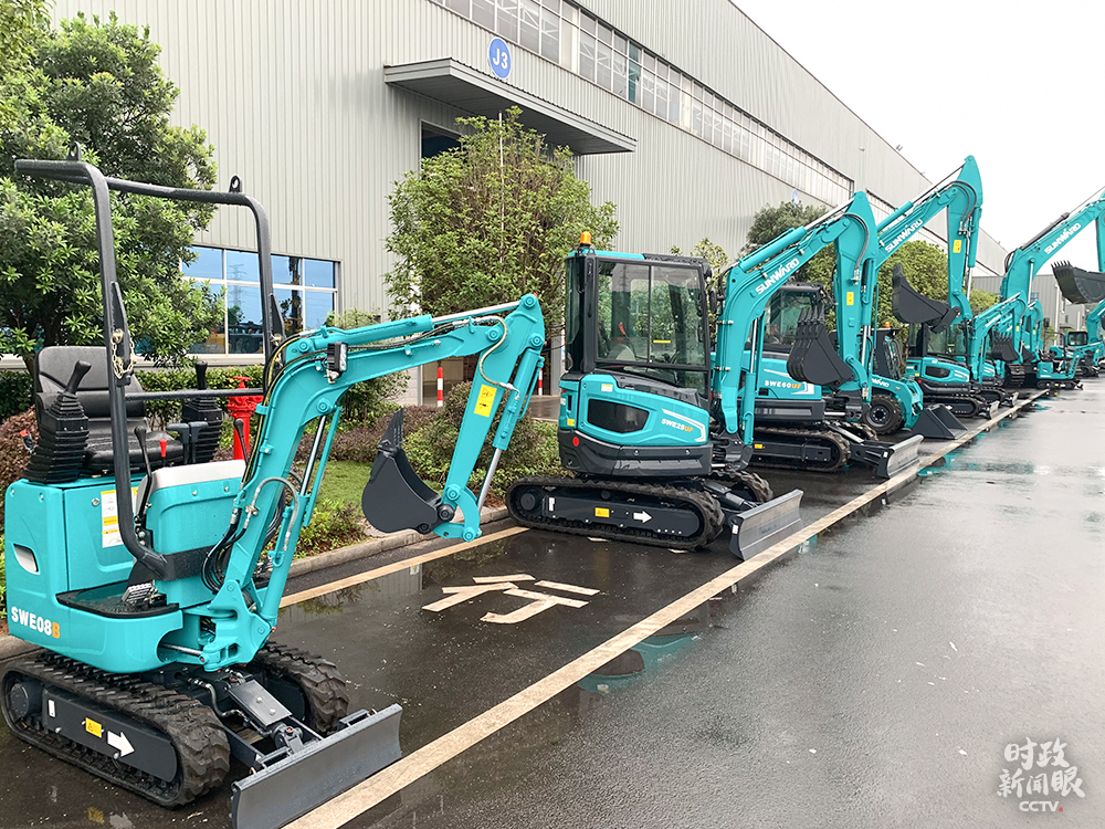 △這是不同型號的微型挖掘機,特點是動臂可偏轉,底盤可伸縮,適合城市改造、農田水利等小規模項目。(總枱央視記者章猛拍攝)