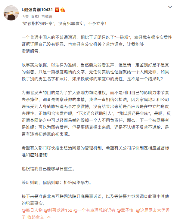 近日,梁穎女士在網上發文稱遭到羅冠軍強姦一事曾引發大量關注。