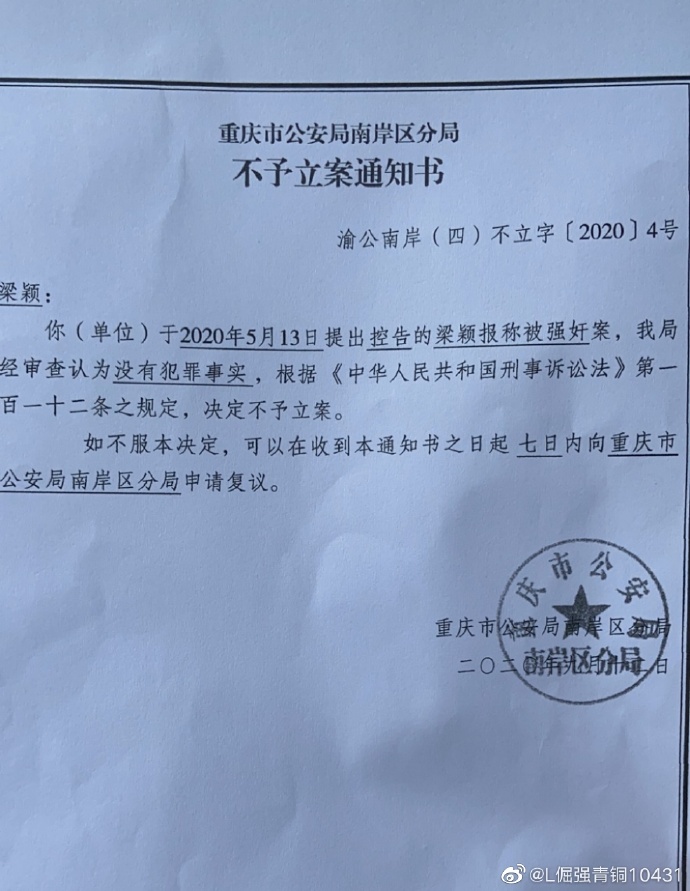 9月18日,微博介紹為“當事人羅冠軍”的賬號@L倔強青銅10431 發佈消息稱,重慶市公安局南岸區分局的不予立案通知書顯示,梁穎報稱被強姦案經審查認為沒有犯罪事實,決定不予立案。