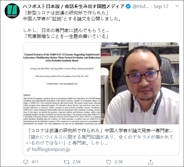 【文/觀察者網 鞠峯】香港大學前僱員閆麗夢反覆炒作“新冠病毒人造論”並污衊中國“隱瞞疫情”,港大早已表示“她不是從事病毒研究的學者,主張也沒有科學根據”。但由於閆麗夢在英美媒體上反覆“作妖”,該事件在日本也有不少人關注。在推特日本搜索“武漢研究所”,閆麗夢博客的相關謠言有超過3萬次轉發。
