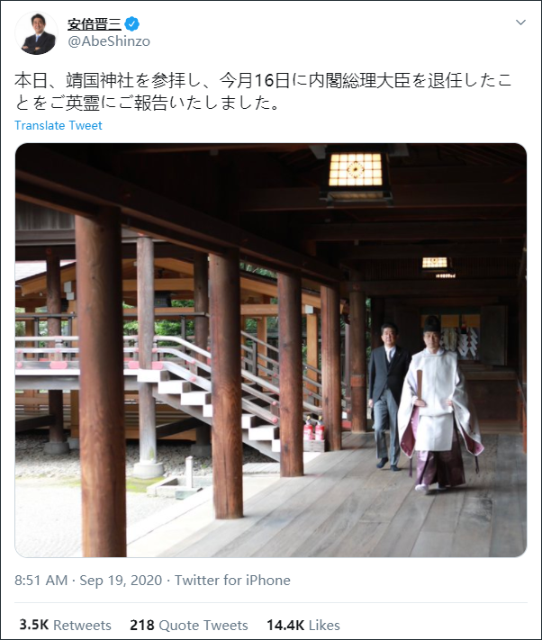 (觀察者網 訊)當地時間19日上午,剛卸任日本首相的安倍晉三在個人官方推特賬號上公佈,他於當日參拜了靖國神社。