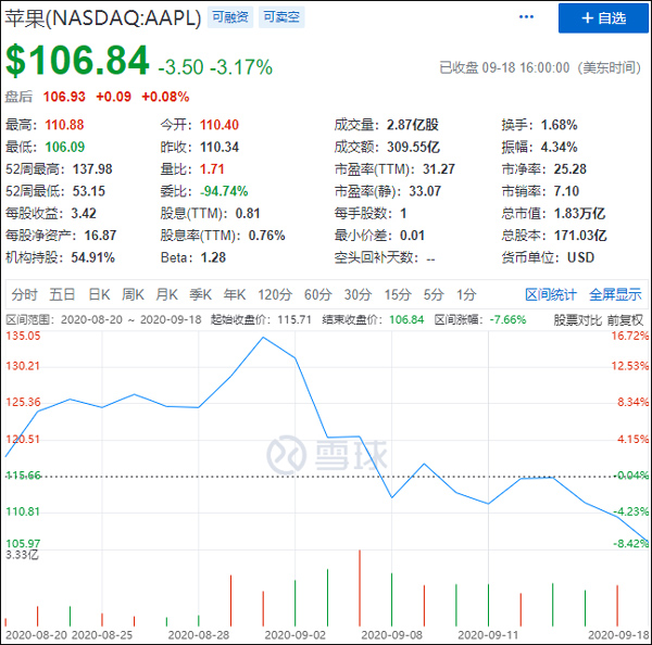 數據顯示,截至週五(9月18日)收盤,蘋果股價報106.84美元,跌幅3.17%,市值1.83萬億美元。這一股價相對於9月2日的盤中最高點(137.98美元/股),下跌了22.6%,損失了大約5360億美元的市值,幾乎相當於8個小米集團。