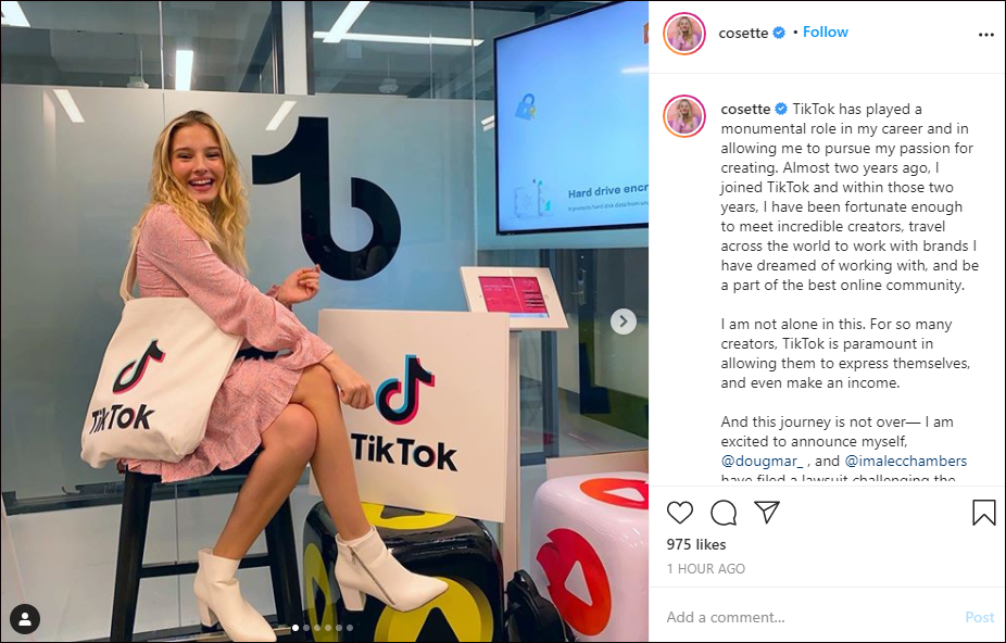 珂賽特宣佈,她將與其他兩名創作者道格·瑪(Dougmar)和阿列克·錢伯斯(Alec Chambers)一同,向特朗普政府提起訴訟,要求特朗普撤銷針對TikTok的禁令。