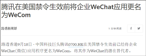 (文/觀察者網 一鳴)9月19日消息,路透社報道稱,在美國對WeChat(微信)的禁令生效前,騰訊已經把企業WeChat微信應用程序更名為WeCom,將其作為WeChat的潛在替代者。
