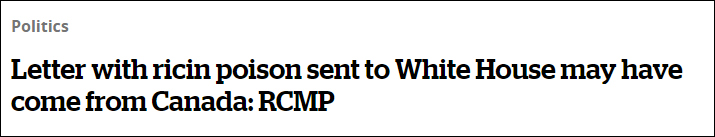 加拿大廣播公司(CBC)19日報道,加拿大皇家騎警當天也表示,寄往白宮的含蓖麻毒素信件可能來自加拿大。