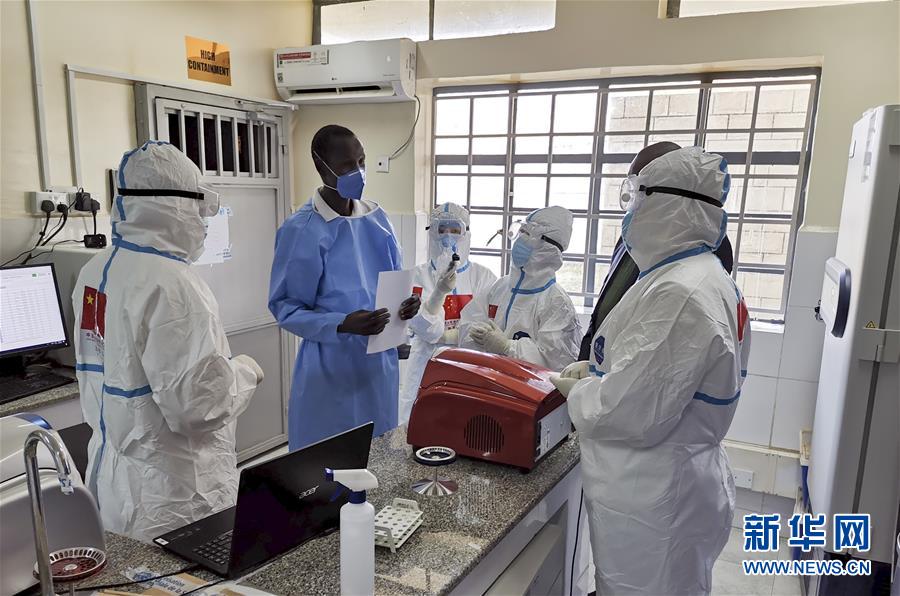 在南蘇丹首都朱巴的一處新冠病毒檢測機構,中國抗疫醫療專家組成員與南一線醫護人員交流(8月21日攝)。新華社發(中國駐南蘇丹大使館供圖)