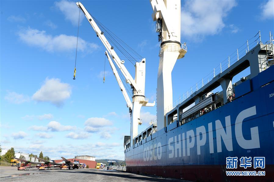2018年9月15日,中遠海運“天恩”輪在瑞典東北部港口城市海訥桑德的碼頭上進行卸貨作業。至此,“天恩”輪首個“冰上絲綢之路”完整航次順利結束。新華社記者 劉紅霞 攝