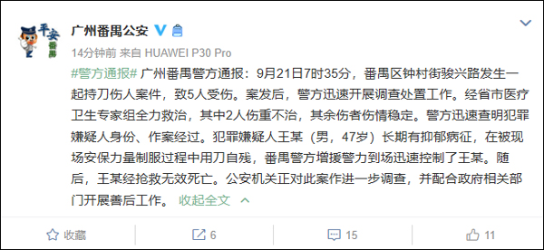 9月21日7時35分,番禺區鍾村街駿興路發生一起持刀傷人案件,致5人受傷。案發後,警方迅速開展調查處置工作。經省市醫療衞生專家組全力救治,其中2人傷重不治,其餘傷者傷情穩定。警方迅速查明犯罪嫌疑人身份、作案經過。犯罪嫌疑人王某(男,47歲)長期有抑鬱病徵,在被現場安保力量制服過程中用刀自殘,番禺警方增援警力到場迅速控制了王某。隨後,王某經搶救無效死亡。公安機關正對此案作進一步調查,並配合政府相關部門開展善後工作。