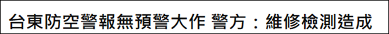 9月20日,親綠媒體“自由時報”、“三立新聞”等炒作“台東防空警報大響”一事。報道稱,有台東民眾20日在社交媒體上爆料,當天下午4時50分左右,台東市豐裏橋、東海中學附近均能聽見明顯的防空警報聲,持續約10秒鐘。