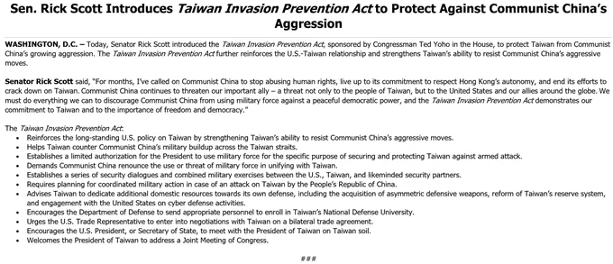 參議員也在國會為政府的這些行動打配合,比如佛羅里達州聯邦參議員斯科特更是直接就提了一項提案,其中的內容就包括:建立有限的授權,讓總統在特定目的下使用武力以保護台灣不受武裝攻擊;