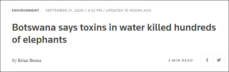 魯賓説:我們的最新檢測發現,藍藻神經毒素是造成(大象)死亡的原因。這些是在水中發現的細菌。他又説:(大象)死亡是由藍藻造成中毒引起,藍藻在窪地或水坑中生長。另外,大象的死亡“在2020年6月底已經停止,正是窪地枯乾的時候”。