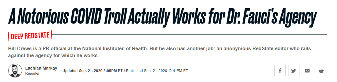 據美國《野獸日報》9月21日報道,威廉·克魯斯(William B. Crews)白天是美國國家過敏與傳染病研究所(NIAID)的公共事務官員,但私下裏多年來一直以“斯特雷夫(streiff)”的筆名,為在極端保守派自媒體“紅色州”(RedState)上寫陰謀論,宣傳虛假信息宣傳活動。