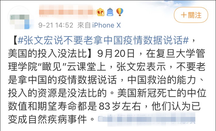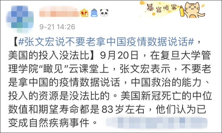 “9月20日,在復旦大學管理學院‘瞰見’雲課堂上,張文宏表示,不要老是拿中國的疫情數據説話,中國救治的能力、投入的資源是沒法比的。美國新冠死亡的中位數值和期望壽命都是83歲左右,他們認為已變成自然疾病事件。”