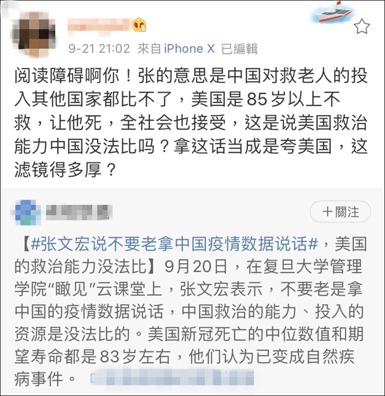 有網民就指出張文宏的意思是“中國對救老人的投入其他國家都比不了,美國是85歲以上不救,全社會也接受……拿這話當成是誇美國,這濾鏡得多厚?”