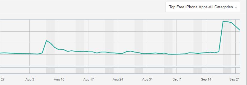9月18日後,WeChat在iPhone應用商店內的下載量排名大幅提升 Sensor Tower數據圖