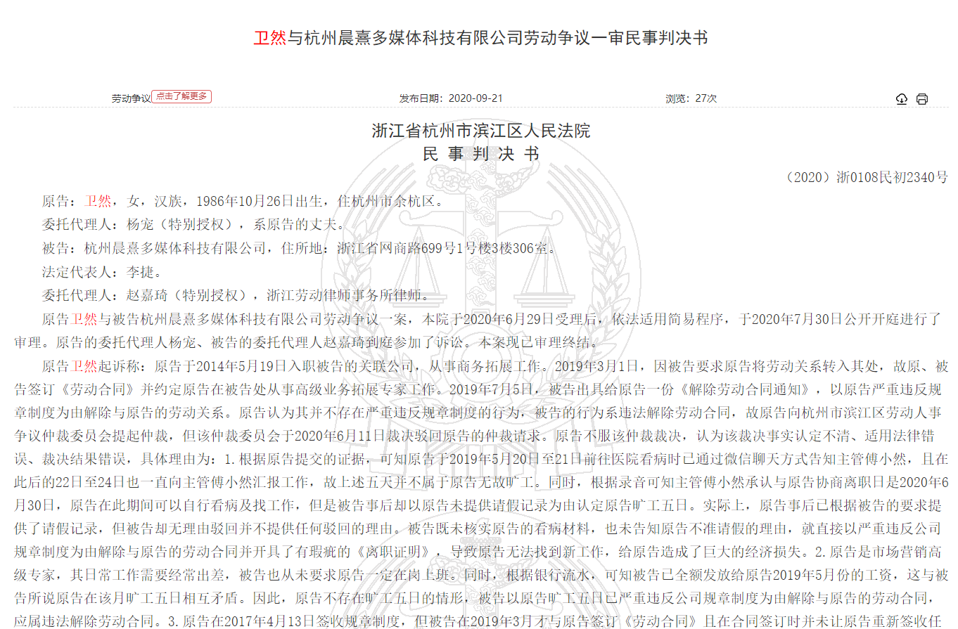 裁判文書顯示,衞某於2014年5月入職,從事商務拓展工作。2019年5月20日,衞某因身體原因前往醫院檢查身體,5月24日一直未上班,後於7月3日補交請假手續。7月5日,企業以曠工5日違反阿里影業《員工管理制度》為由開除衞某,解除勞動合同。