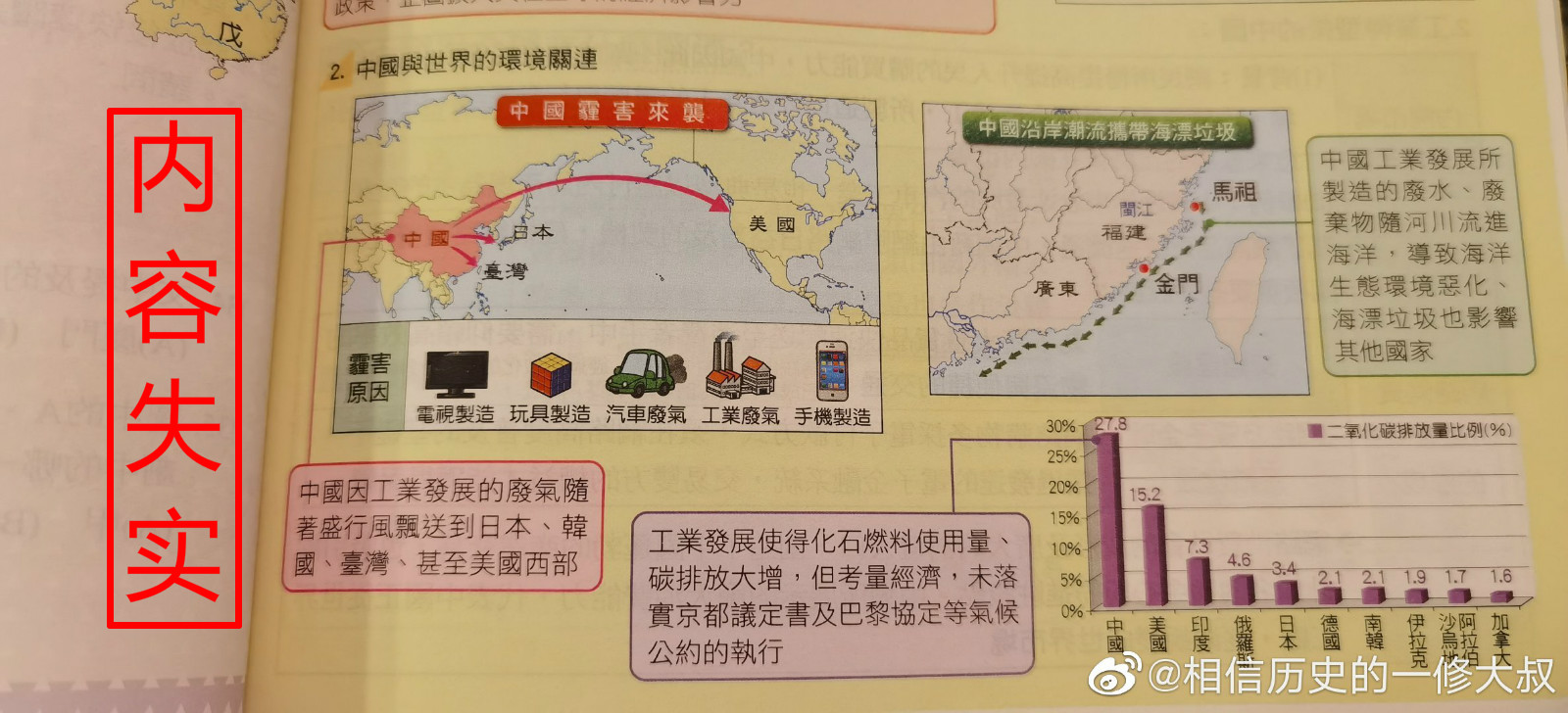 “大陸霧霾飄到美國”?家長曝台灣初二年級地理講義多處抹黑大陸