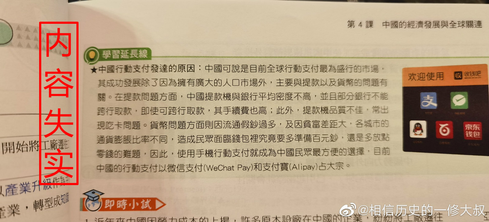 而至於講義中稱“大陸移動支付流行是因為提款機品質不佳”這類的內容,則更像是一則冷笑話,讓人不知如何“反駁”,哭笑不得。