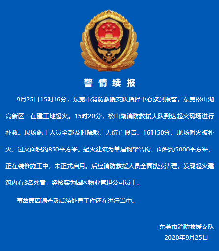 9月25日15時16分,東莞市消防救援支隊指揮中心接到報警,東莞松山湖高新區一在建工地起火。15時20分,松山湖消防救援大隊到達起火現場進行撲救。現場施工人員全部及時疏散,無傷亡報告。16時50分,現場明火被撲滅,過火面積約850平方米。起火建築為單層鋼架結構,面積約5000平方米,正在裝修施工中,未正式啓用。後經消防救援人員全面搜索清理,發現起火建築內有3名死者,經核實為園區物業管理公司員工。